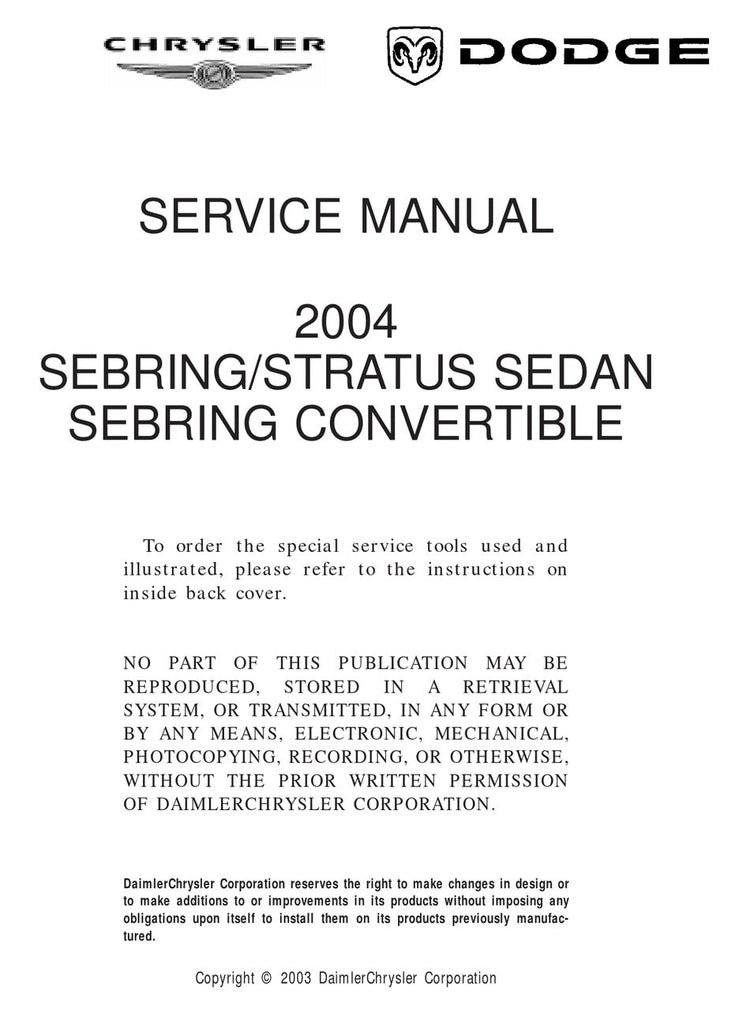 This Service Repair Manual offers all the service & repair information for 2004 Chrysler JR Sebring / Stratus Sedan and Convertible. With this in-depth & highly detailed manual you will be able to work on your vehicle with the absolute best resources available. The information on this manual covered everything you need to know when you want to repair & service 2004 Chrysler JR Sebring / Stratus Sedan and Convertible.