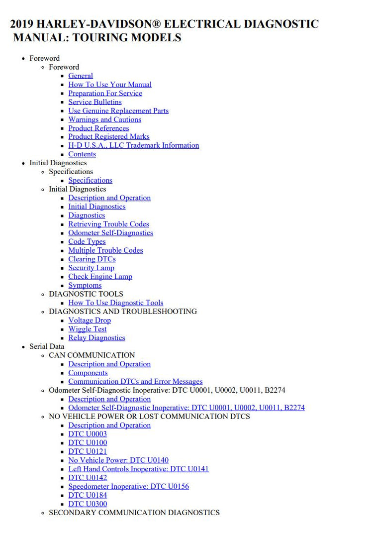 Unlock the full potential of your 2019 Harley-Davidson Touring model with our comprehensive Electrical Diagnostic Manual PDF. This essential guide provides detailed troubleshooting steps, wiring diagrams, and diagnostic procedures tailored specifically for your motorcycle's electrical system. Whether you're a seasoned mechanic or a DIY enthusiast, this manual empowers you to efficiently diagnose and resolve electrical issues, ensuring your ride remains smooth and reliable. Download your copy today and take the guesswork out of electrical repairs!