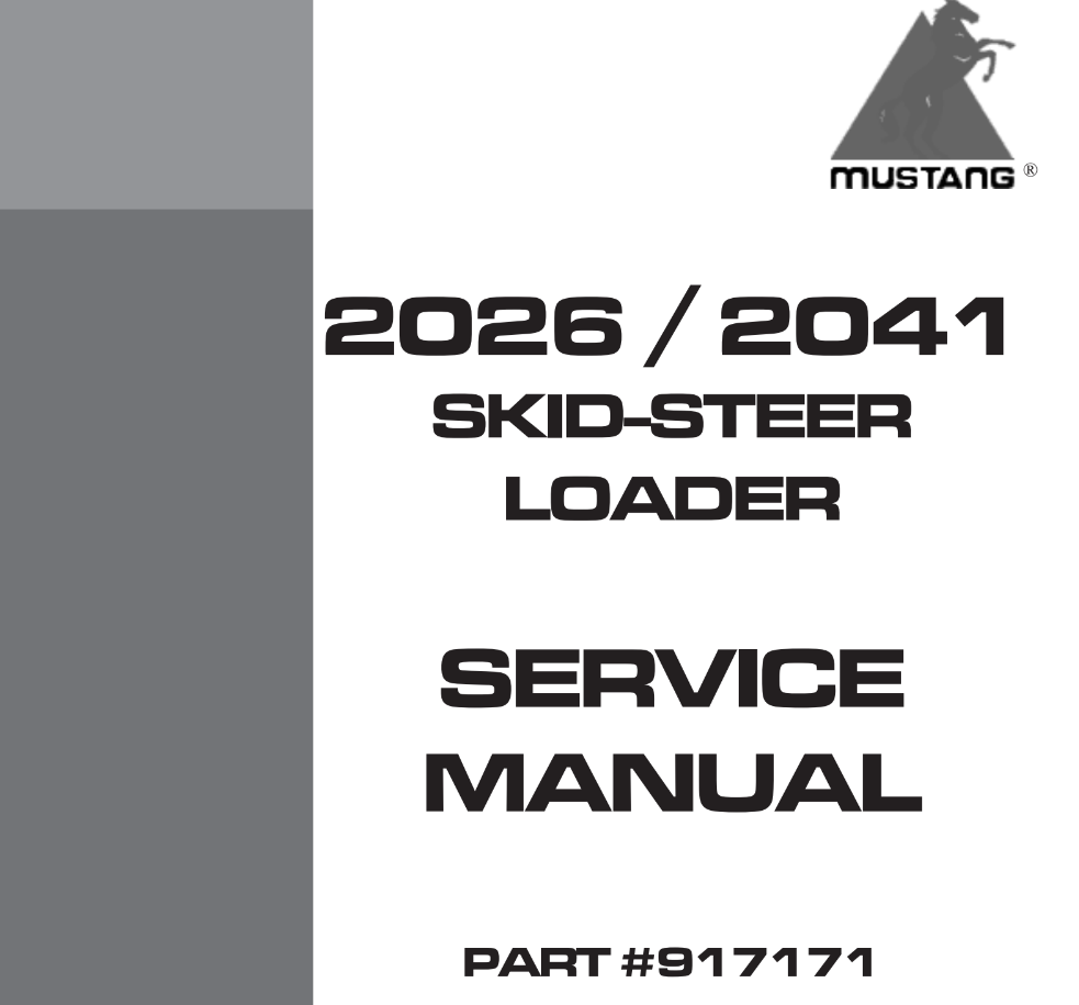 Stay up-to-date on servicing and repair procedures for your Mustang 2026 & 2041 Skid Steer Loader with this comprehensive Service Repair Manual (PART#917171). Get the latest Revision A - 01/06 manual in PDF file format for quick, easy downloading.