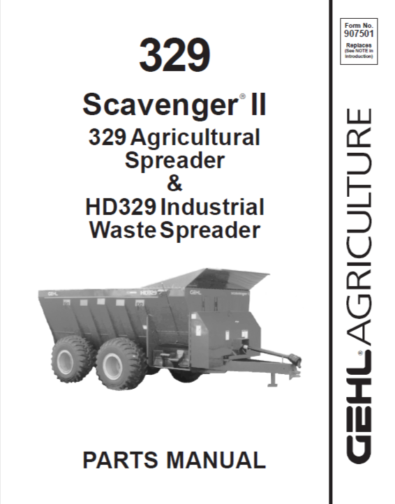 Download Complete Parts Manual for Gehl Scavenger II 329 Agricultural Spreader & HD329 Industrial Waste Spreader. Form No: 907501