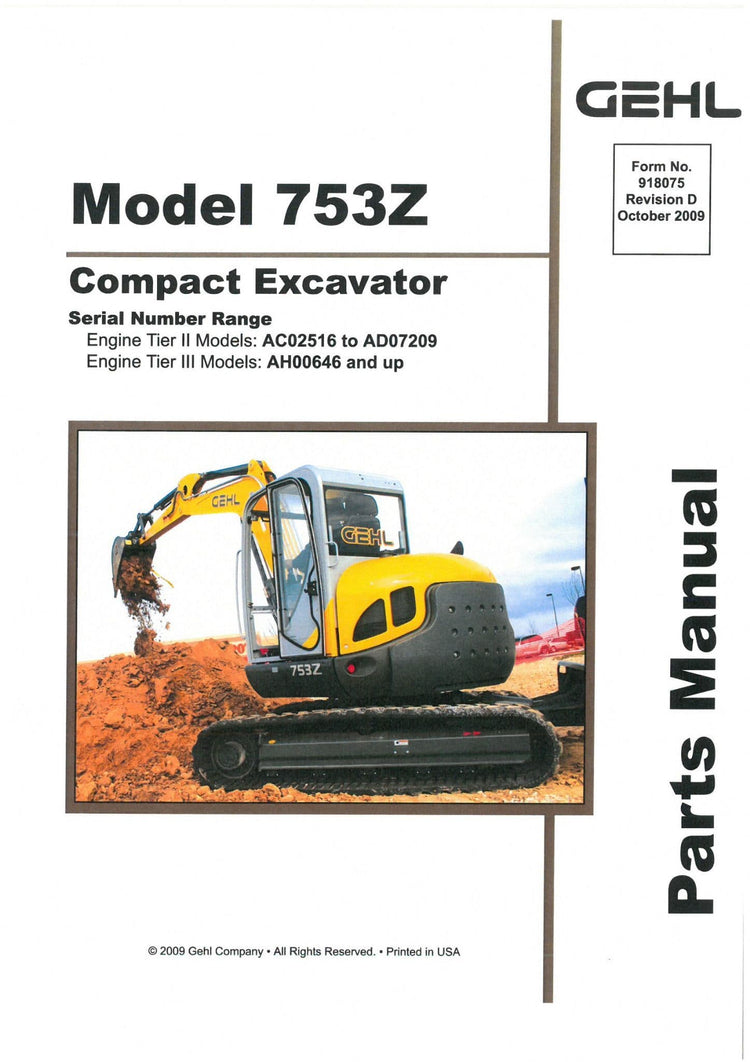 This Factory Parts Manual offers all the Parts information's for Gehl 753Z Compact Excavator. The information on this manual covered everything you need to know when you want to 753Z Compact Excavator.