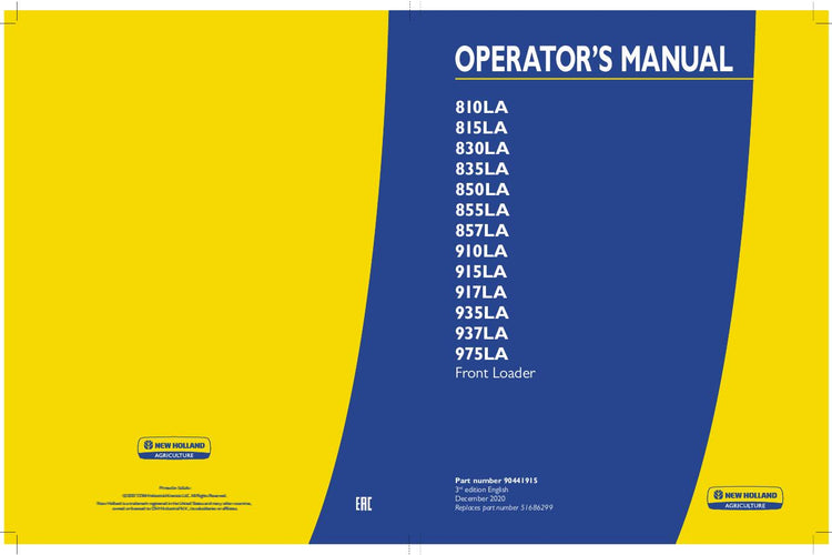 810LA, 815LA, 830LA, 835LA, 850LA, 855LA, 857LA, 910LA, 915LA, 917LA, 935LA, 937LA, 975LA Front Loader - New Holland Operator's Manual 51425187, 51686299, 90441915 Download PDF - Manual labs
