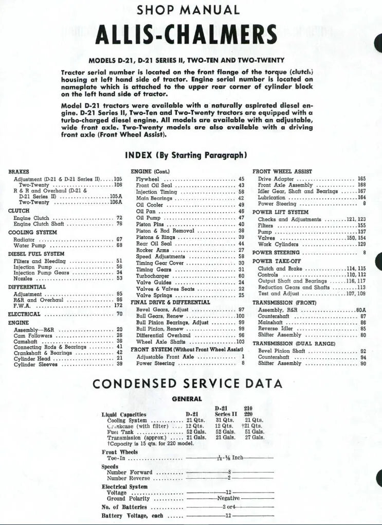 This Allis Chalmers service repair manual is designed to provide expert insight into the maintenance and repair of Allis Chalmers D21, D-21 SERIES II, 210 & 220 tractors. Download this PDF file to access detailed diagrams and step-by-step instructions that will ensure reliability and a long-lasting service life.