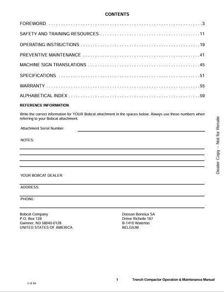 1. Enhance the performance and longevity of your Bobcat Trench Compactor with the comprehensive Operation & Maintenance Manual (6900823ENUS). This PDF download provides essential insights into the proper operation, maintenance routines, and troubleshooting tips, ensuring your equipment runs smoothly and efficiently.