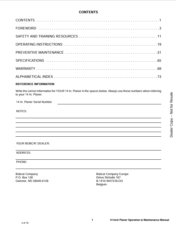 1. Discover the essential BOBCAT 14IN PLANER (6901034ENUS) Operation & Maintenance Manual, a comprehensive PDF guide designed to enhance your experience with this powerful tool. This manual provides detailed instructions on operation, maintenance, and troubleshooting, ensuring you get the most out of your planer.