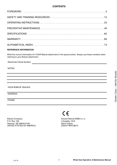 1. Enhance your operational efficiency with the BOBCAT WHEEL SAW WSSL20 (7335776ENGB) Operation and Maintenance Manual. This comprehensive PDF file is designed to provide you with essential information for the effective use and upkeep of your wheel saw, ensuring optimal performance in various applications.