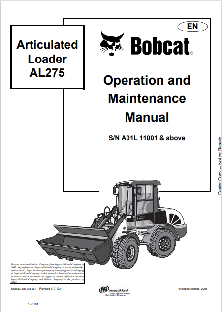 DOWNLOAD COMPLETE PDF FILE FOR BOBCAT AL275 ARTICULATED LOADER OPERATION AND MAINTENANCE MANUAL (4900052)
