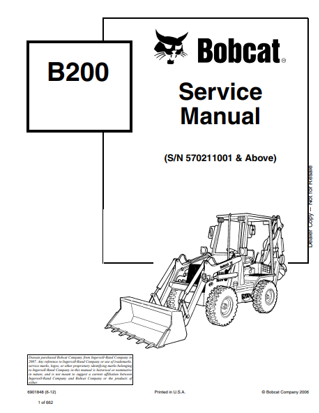 Access the BOBCAT B200 Service Manual (6901848) in PDF format. Get detailed maintenance and repair information to keep your equipment running smoothly.