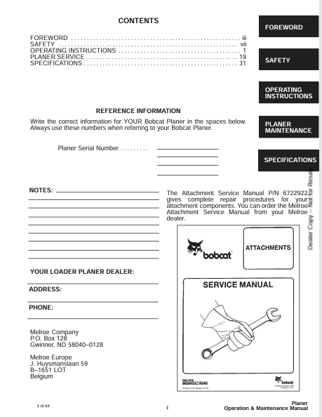 1. Enhance your Bobcat Planer's performance with the comprehensive Operation & Maintenance Manual (6722362) available in a convenient PDF format. This essential guide provides detailed instructions and insights to ensure your equipment operates at peak efficiency, helping you achieve professional results every time.