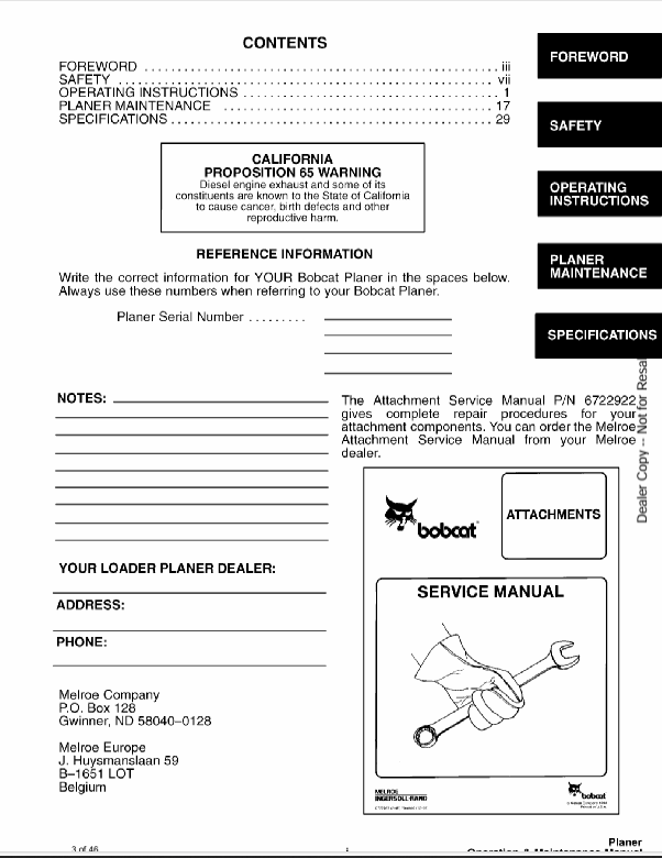 2. Inside, you'll find detailed instructions on operation, maintenance schedules, and troubleshooting tips tailored specifically for the BOBCAT PLANER. With clear diagrams and step-by-step procedures, this manual empowers you to perform routine checks and repairs with confidence, minimizing downtime and enhancing productivity.