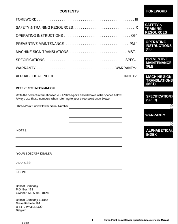1. Ensure your Bobcat Three-Point Snow Blower operates at peak performance with the comprehensive Operation & Maintenance Manual (PDF Download). This essential guide provides detailed instructions on setup, operation, and maintenance, helping you maximize efficiency during winter months.