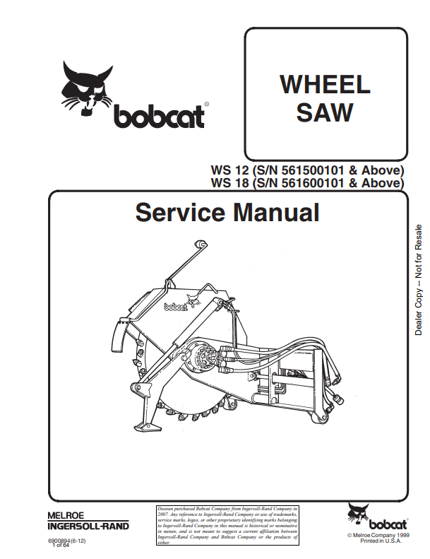 1. Discover the comprehensive service manual for BOBCAT WS12, WS18 Wheel Saw (6900894). Download the PDF for expert guidance and maintenance tips.