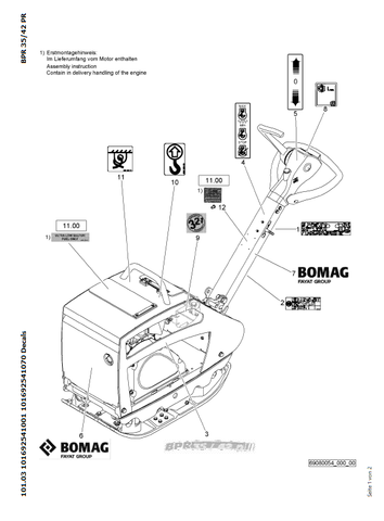 This parts catalogue manual contains detailed diagrams and parts lists for Bomag BPR 35/42 D/H Reversible Vibrating Plates. Download this PDF file to ensure accuracy and accuracy when buying parts for the Bomag BPR 35/42 D/H Reversible Vibrating Plate (Serial Number: 00824311, Pub. 101692541130).