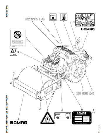 Expertly navigate the construction site with the Bomag BW 225 D-3 Single Drum Vibratory Roller. This PDF parts catalogue manual, covering serial numbers 00815360 to 101580601069, provides detailed information on the Earth and Sanitary Landfill Construction. Download now for reliable and efficient operation.
