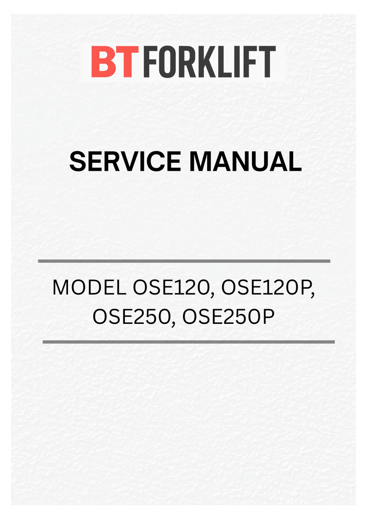 Comprehensive service manual for BT forklift trucks covering OSE120, OSE120P, OSE250, and OSE250P models. This PDF resource provides detailed technical documentation including maintenance procedures, troubleshooting guides, parts diagrams, and operational specifications. Essential for technicians, operators, and maintenance teams requiring authoritative repair and service information. Instant digital download ensures quick access to critical maintenance data whenever needed.