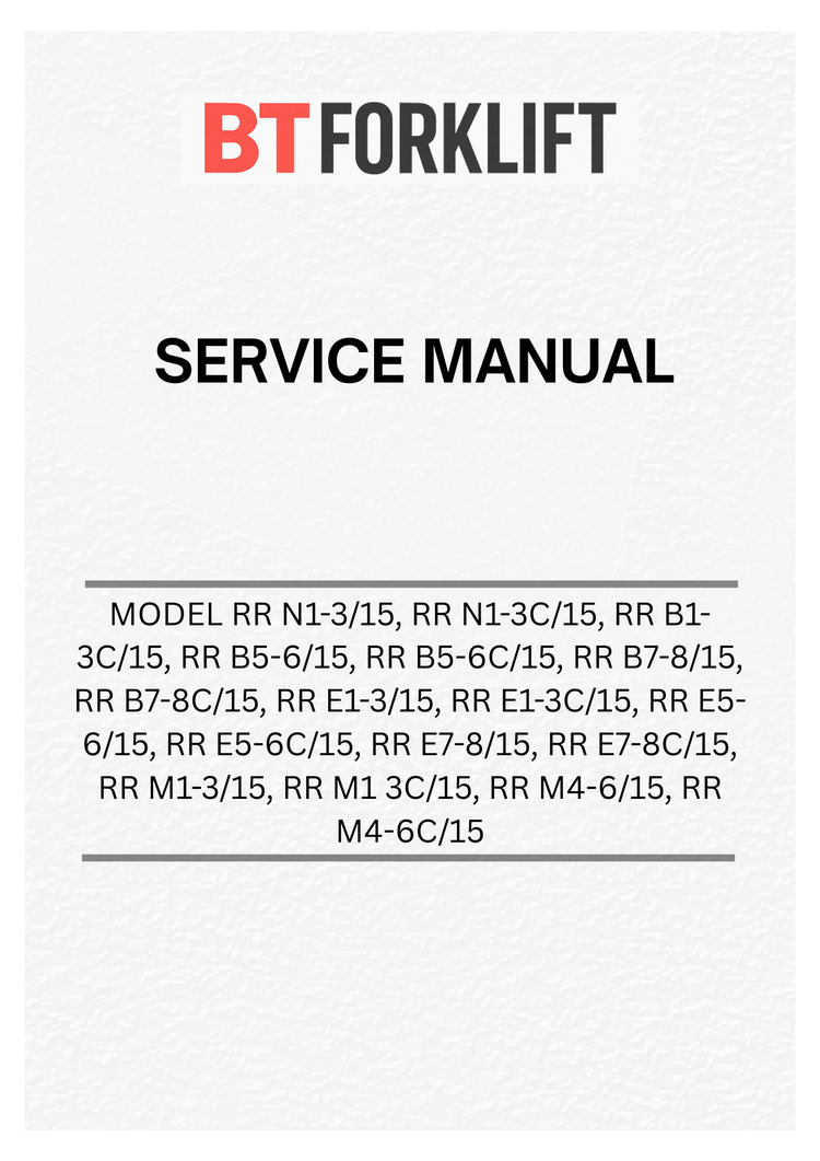 BT Forklift Truck RR N1-3/15, RR N1-3C/15, RR B1-3C/15, RR B5-6/15, RR B5-6C/15, RR B7-8/15, RR B7-8C/15, RR E1-3/15, RR E1-3C/15, RR E5-6/15, RR E5-6C/15, RR E7-8/15, RR E7-8C/15, RR M1-3/15, RR M1 3C/15, RR M4-6/15, RR M4-6C/15 Service Manual - PDF File