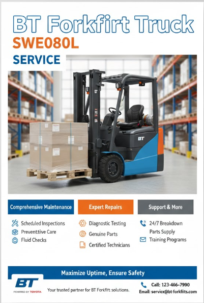 The BT Forklift Truck SWE080L Service Manual provides comprehensive technical documentation for maintenance, repair, and operation of this industrial lift truck model. This PDF file contains detailed specifications, troubleshooting procedures, component diagrams, and service intervals essential for technicians and operators. Access critical information on hydraulic systems, electrical components, safety protocols, and routine maintenance tasks. Ideal for fleet managers, certified mechanics, and equipment operators requiring authoritative guidance on keeping the SWE080L in peak operational condition.