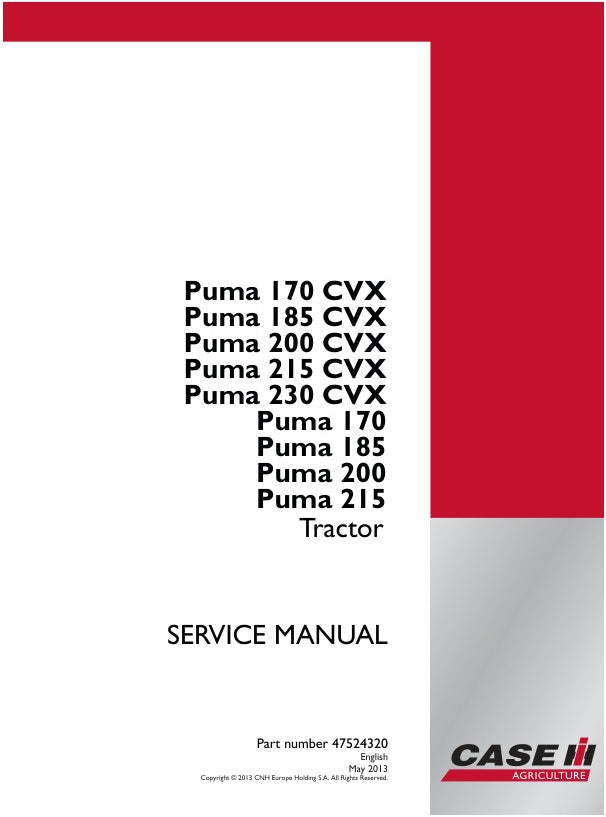 1. Enhance your CASE tractor maintenance with the CASE 170, 185, 200, 215, 230 CVX Tractor Service Manual (Part No. 47524320). This comprehensive guide is designed specifically for these models, providing you with detailed instructions and diagrams to ensure your tractor operates at peak performance.