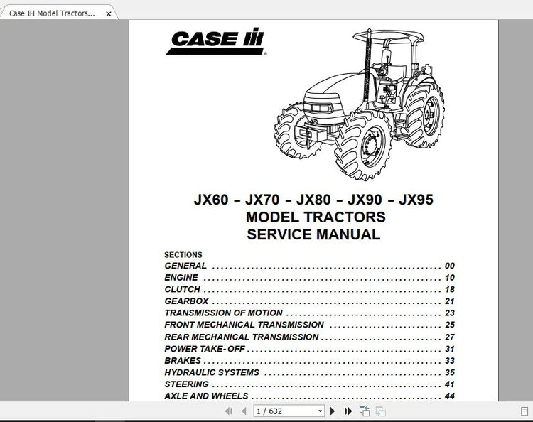 UNLOCK THE FULL POTENTIAL OF YOUR CASE IH TRACTORS WITH THE COMPREHENSIVE JX60 – JX70 – JX80 – JX90 – JX95 SERVICE MANUAL. THIS EXPERTLY CRAFTED PDF FILE IS YOUR GO-TO RESOURCE FOR DETAILED MAINTENANCE AND REPAIR GUIDANCE, ENSURING YOUR EQUIPMENT OPERATES AT PEAK PERFORMANCE.