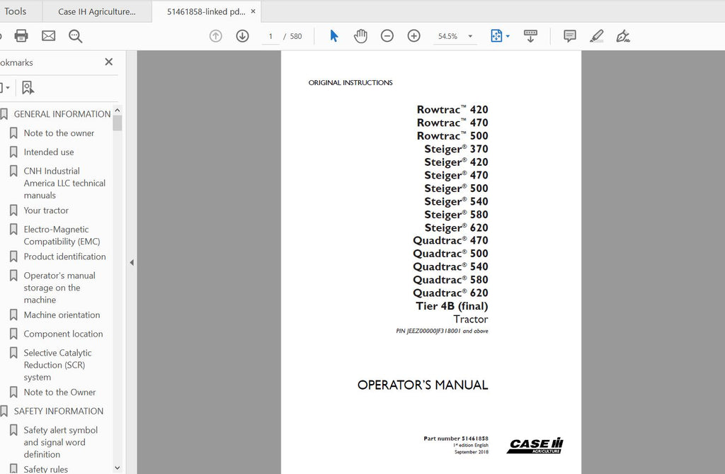 DISCOVER THE ESSENTIAL CASE IH TRACTOR ROWTRAC STEIGER QUADTRAC 470, 500, 540, 580, AND 620 TIER 4B (FINAL) OPERATOR’S MANUAL, AVAILABLE IN A CONVENIENT PDF FORMAT. THIS COMPREHENSIVE GUIDE IS DESIGNED TO ENHANCE YOUR UNDERSTANDING OF YOUR POWERFUL MACHINERY, ENSURING YOU GET THE MOST OUT OF YOUR INVESTMENT. WITH DETAILED INSTRUCTIONS AND SPECIFICATIONS, YOU CAN CONFIDENTLY OPERATE AND MAINTAIN YOUR TRACTOR FOR OPTIMAL PERFORMANCE.