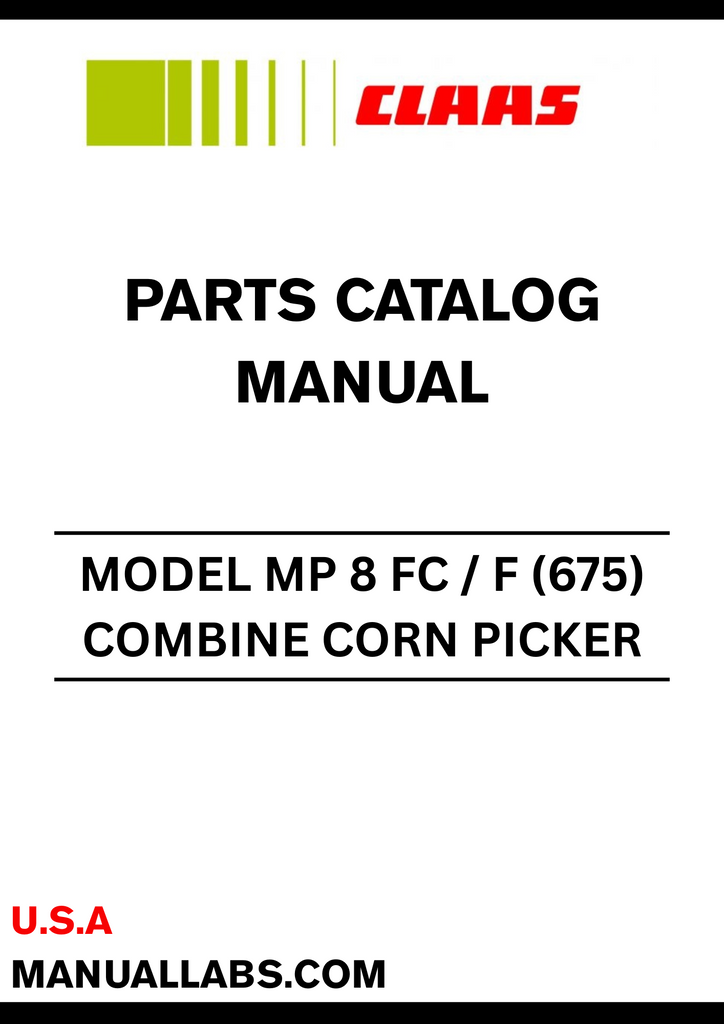 1. Discover the essential CLAAS Combine Corn Picker MP 8 FC / F Parts Catalogue Manual, specifically designed for serial numbers 67501001 to 67599999. This comprehensive guide provides detailed information on all parts, ensuring you have the right components for maintenance and repairs.