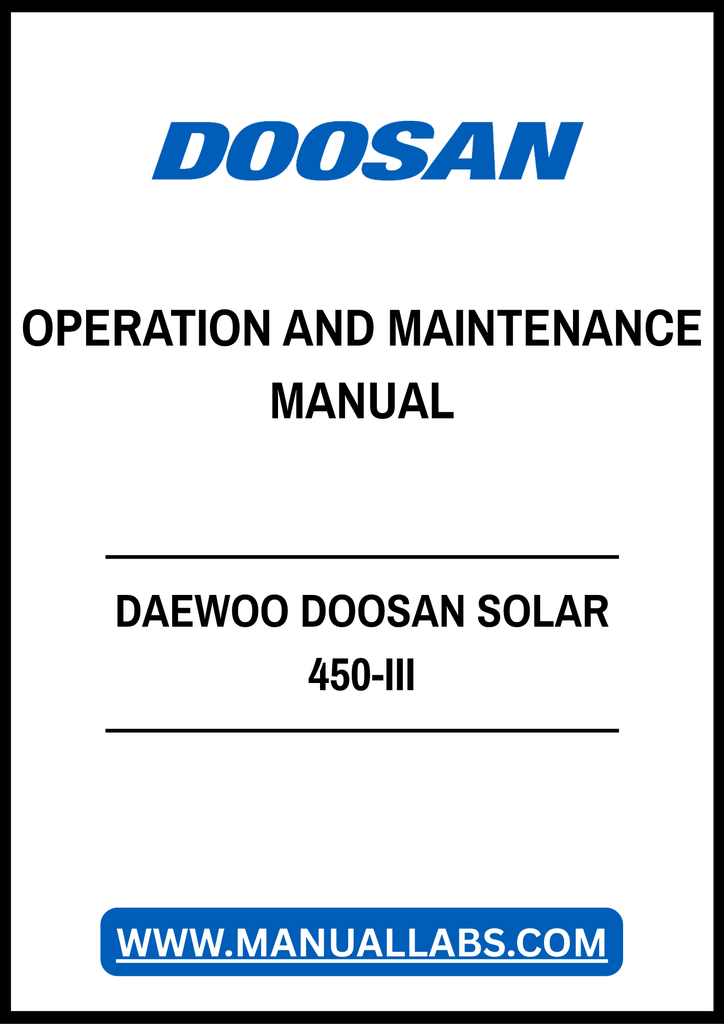 1. Enhance your operational efficiency with the DAEWOO DOOSAN SOLAR 450-III Operation and Maintenance Manual, available in a convenient PDF format. This comprehensive guide is designed to provide you with essential information for the effective management and upkeep of your equipment, ensuring optimal performance and longevity.