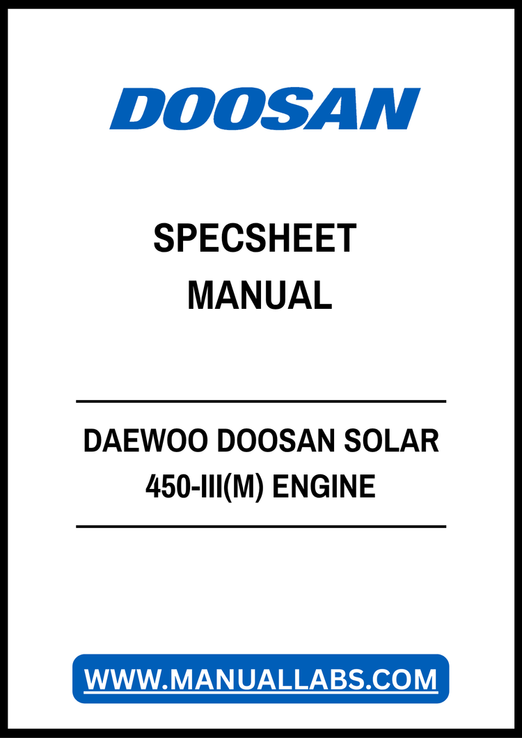 1. Discover the comprehensive DAEWOO DOOSAN SOLAR 450-III(M) Engine Specsheet Manual, available in a convenient PDF format. This essential resource provides detailed specifications and insights into the engine's performance, ensuring you have all the information you need at your fingertips.