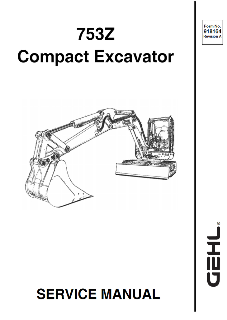 Technical manuals are essential for any maintenance and repair on the Gehl Compact Excavator 753Z. This PDF repair manual provides detailed instructions for servicing the machine, ensuring optimal performance. Download, save, and print this 918164 service manual to keep your excavator working at its best.
