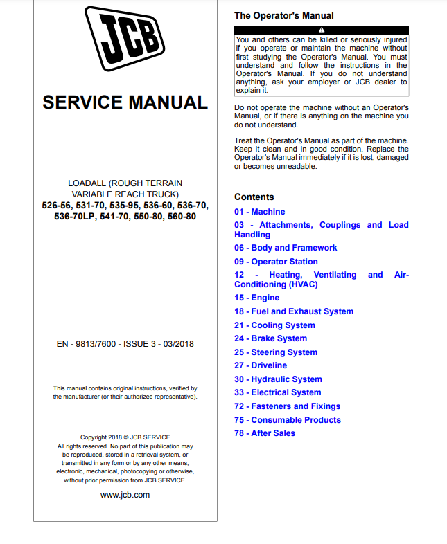 Download Pdf JCB 531-70, 535-95, 536-60, 536-70, 536-70LP, 541-70, 550-80, 560-80 Telehandler/Loadall Rough Terrain Variable Reach Truck Service Repair Manual