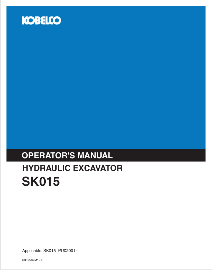1. Unlock the full potential of your KOBELCO SK015 Hydraulic Excavator with the comprehensive Operator Manual (6009582M1-00) available in a convenient PDF format. This essential guide is designed to enhance your operational efficiency and ensure safe usage, making it a must-have for both seasoned operators and newcomers alike.