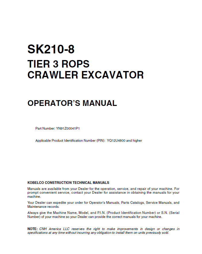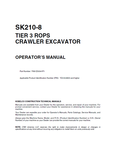 DOWNLOAD COMPLETE PDF OPERATOR MANUAL FOR Kobelco Kobelco Crawler Excavator SK210-8Tier 3 ROPS| Part Number: YN91Z00041P1