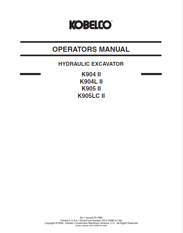 1. Discover the comprehensive operator manual for KOBELCO Hydraulic Excavators K904 II, K904L II, K905 II, and K905LC II. Enhance your operational efficiency today.