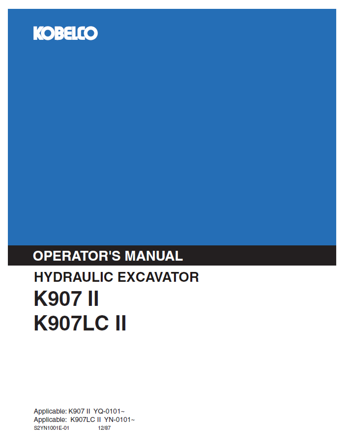 1. Discover the KOBELCO Hydraulic Excavator K907 II and K907LC II Operator Manual. Access essential guidelines for optimal operation and maintenance.