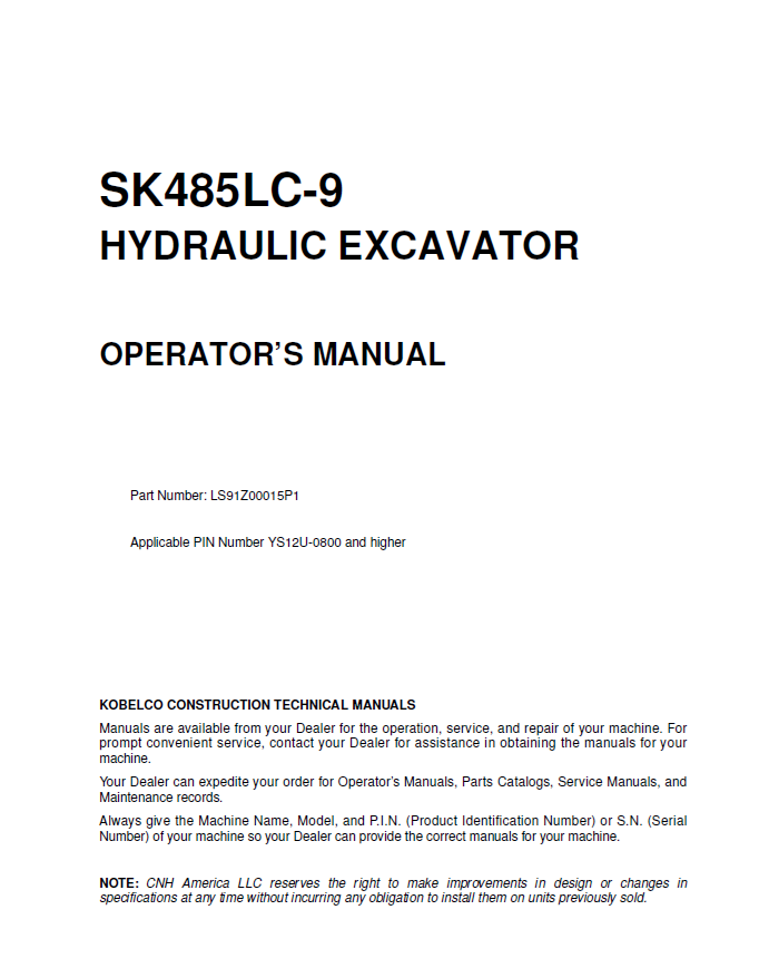 1. Discover the KOBELCO SK485LC-9 Tier 4 operator manual, your essential guide for efficient operation and maintenance of this advanced hydraulic excavator.