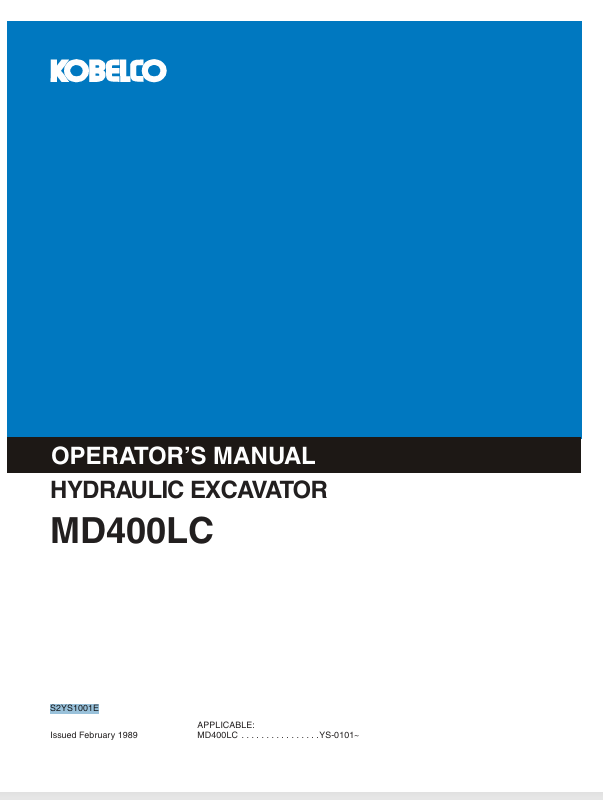 1. Discover the essential KOBELCO MD400LC (S2YS1001E) Operator Manual, now available in a convenient PDF format. This comprehensive guide is designed to enhance your operational efficiency and ensure you get the most out of your equipment. With detailed instructions and clear illustrations, you can easily navigate the features and functions of the MD400LC.