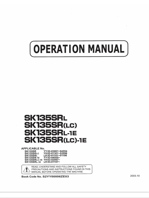 1. Unlock the full potential of your KOBELCO SK135SR Hydraulic Excavator with the comprehensive Operator Manual (S2YY00006ZE03) in PDF format. This essential guide provides detailed instructions and insights to ensure optimal performance and maintenance of your machine, making it an invaluable resource for operators and technicians alike.