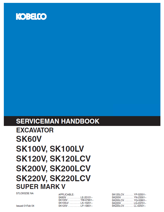 • Kobelco SK60V SK100V SK120V SK120LCV SK200V SK200LCV SK220V SK220LCV Super Mark 4 EXCAVATOR Shop Service Repair Manual (2020)
