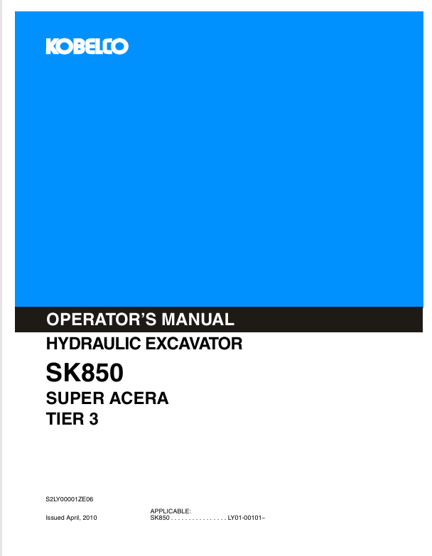 1. Unlock the full potential of your KOBELCO SK850 Hydraulic Excavator with the comprehensive Operator Manual (S2LY00001ZE06) in PDF format. This essential guide provides detailed instructions and insights to ensure optimal performance and maintenance of your machine, making it an invaluable resource for operators and technicians alike.