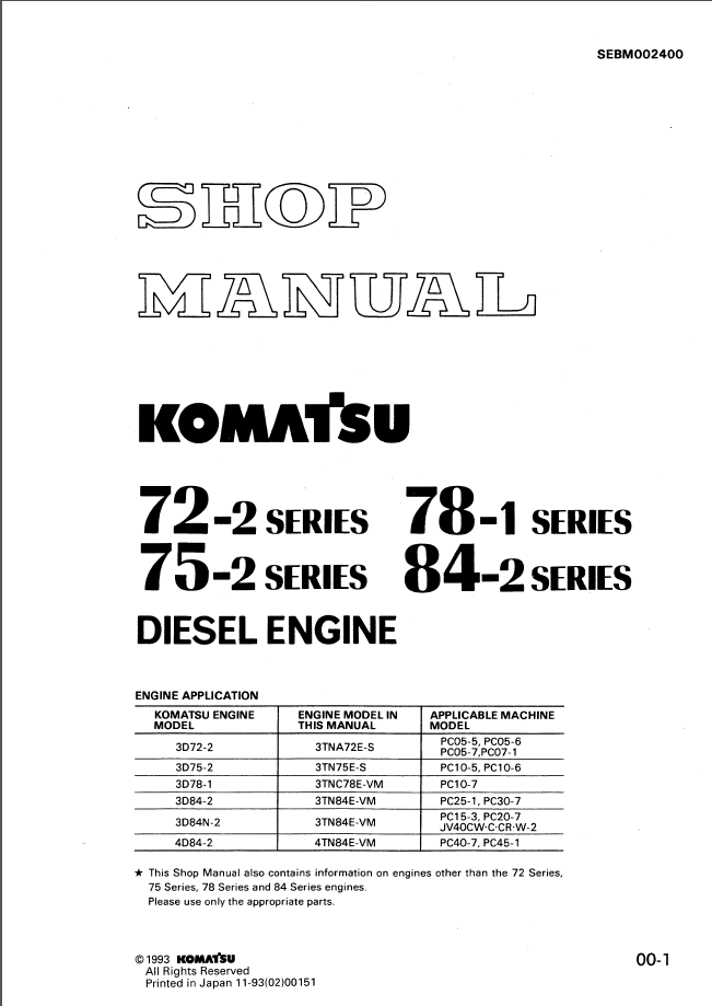 Download Complete Shop Manual For Komatsu 3D84-2E (72-2, 78-1, 75-2, 84-2) Series Engine | SEBM002400