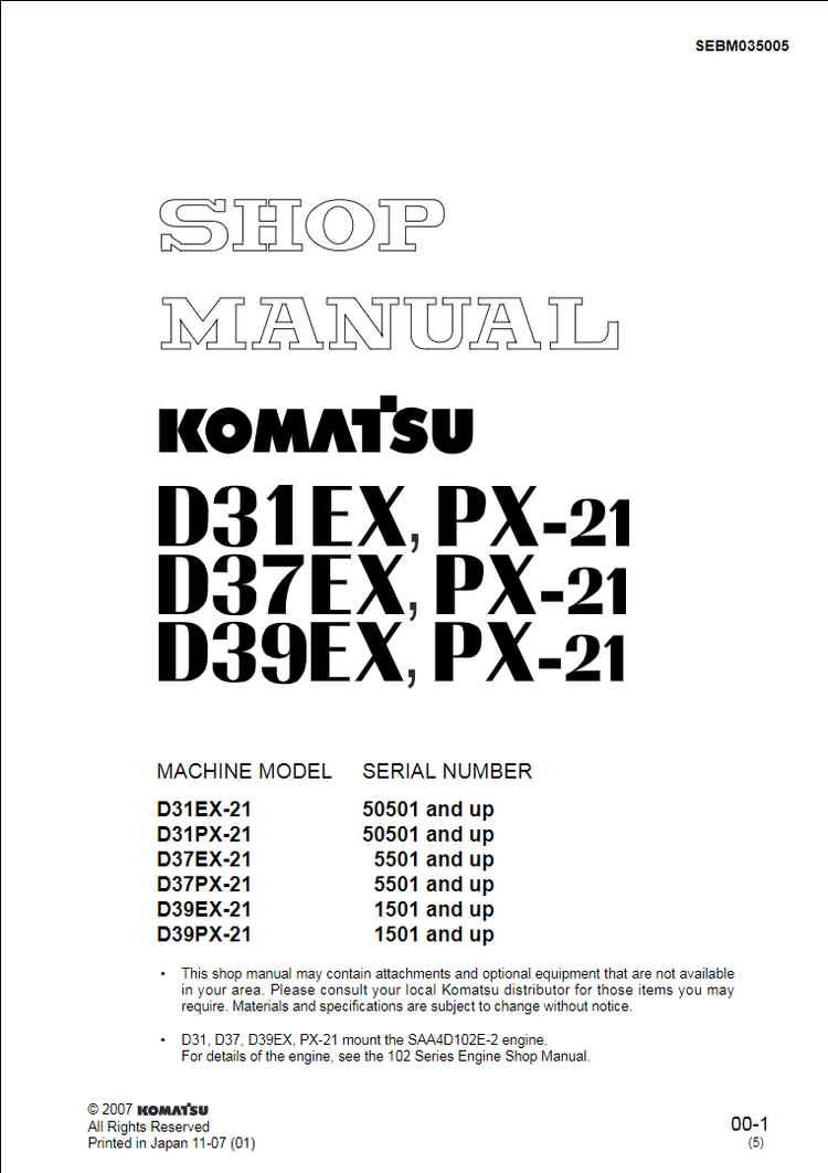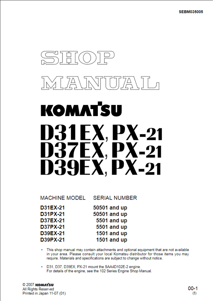 This Komatsu D31EX, D37EX, and D39EX PX-21 Crawler Dozer Shop Service Repair Manual is an essential resource for operators looking to maximize the performance and service life of their equipment. Downloadable PDF format ensures easy access to up-to-date and comprehensive technical information for repairing and maintaining the D31EX, D37EX, and D39EX PX-21 Crawler Dozer, starting from serial number 1501.