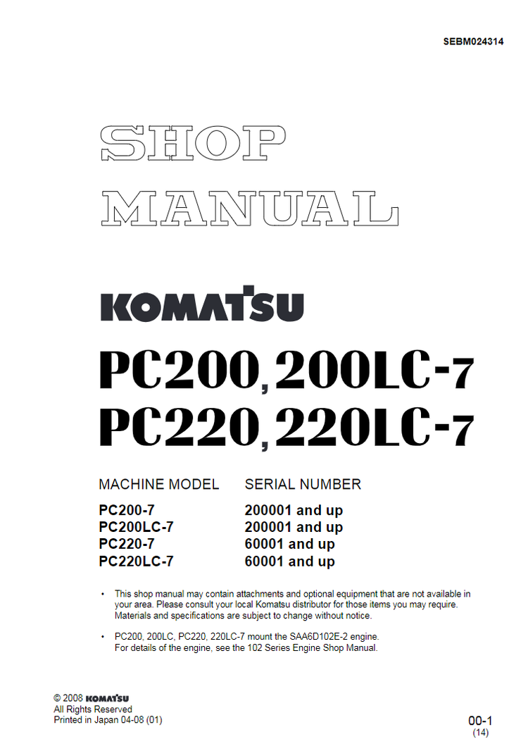 Download Complete Shop Service Repair Manual For Komatsu PC200LC-7 Excavator | 1SEBM024314