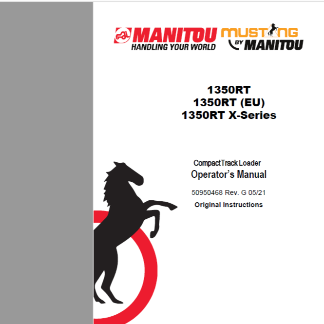 Download the Mustang 1350RT Track Loader Operator Manual (50950468G) in PDF format. This comprehensive manual provides operating and maintenance instructions, safety procedures, and detailed service information for the Mustang 1350RT Track Loader. Keep your loader running smoothly with this reliable resource.
