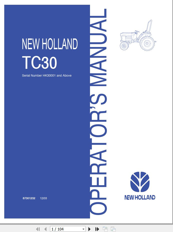 New Holland Compact Tractor TC30 HK30001 Operator’s Manual 87301232 - Manual labs