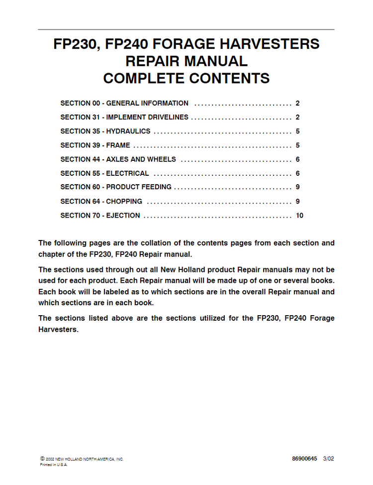 New Holland FP230, FP240 Harvester Service Repair Manual 86900645 - PDF File Download