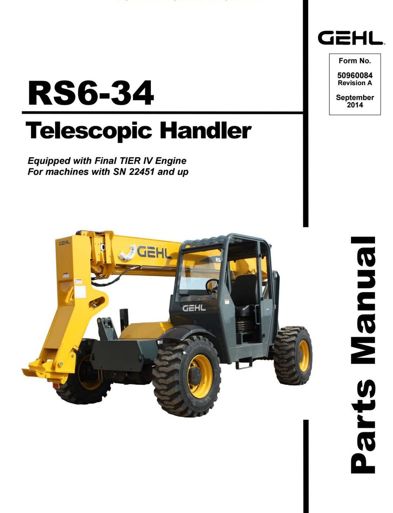 This Factory Parts Manual offers all the parts information about Gehl RS6-34 Telescopic Handler. The information on this manual covered parts information you need to know when you want to repair or service Gehl RS6-34 Telescopic Handler.