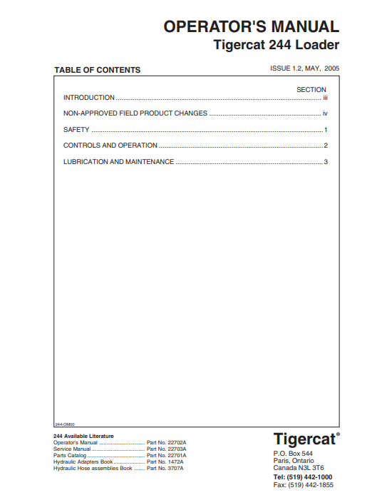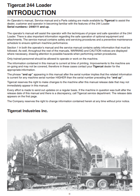 Download Complete Operator/User Manual PDF For Tigercat 244 Loader | Serial No. (2440111-2440500)