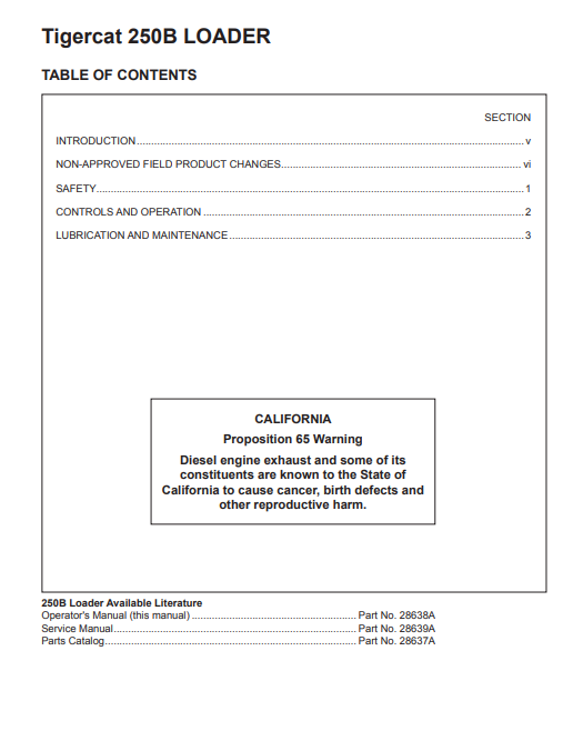 Learn how to operate the Tigercat 250B Loader like a pro with our comprehensive Operator/User Manual. This PDF file download includes all the essential information, from safety guidelines to troubleshooting tips, to help you get the most out of your machine. Increase efficiency and productivity with our expert guide.