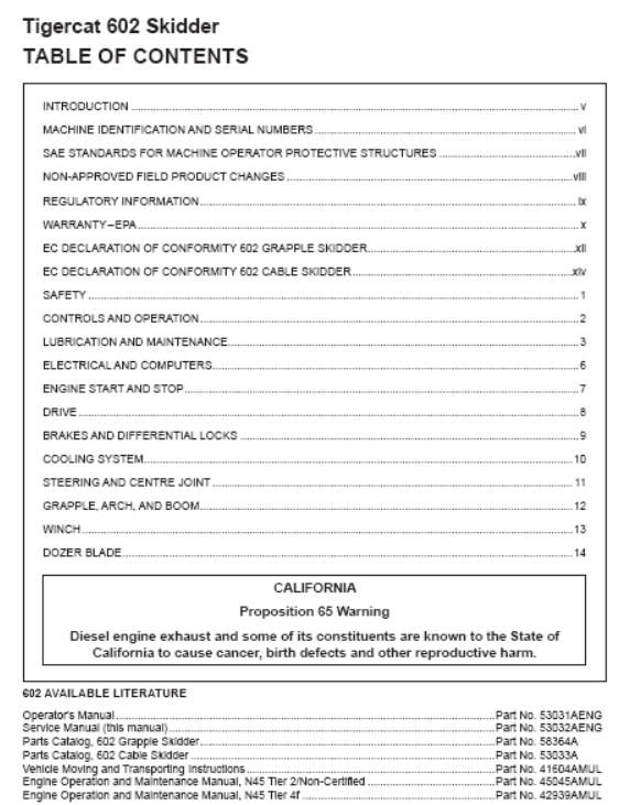 Introduction Machine Identification And Serial Numbers Sae Standards For Machine Operator Protective Structures Non-approved Field Product Changes. Regulatory Information Warranty-epa Ec Declaration Of Conformity 602 Grapple Skidder Ec Declaration Of Conformity 602 Cable Skidder Safety Controls And Operation Lubrication And Maintenance Electrical And Computers Engine Start And Stop Drive Brakes And Differential Locks Cooling System Steering And Centre Joint Grapple Arch, And Boom Winch Dozer Blade