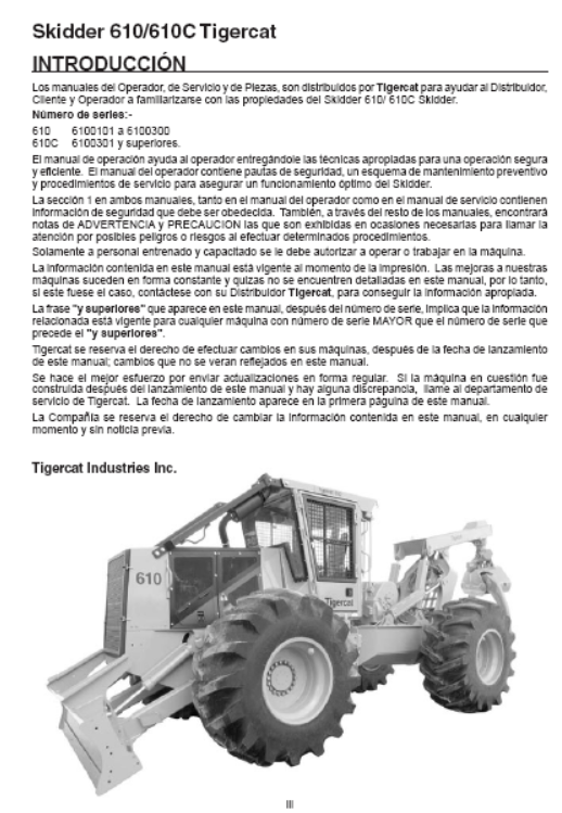 Download Complete Operator/User Manual PDF For Tigercat 610 Skidder | Serial No. (6100101-6100300) - Spanish