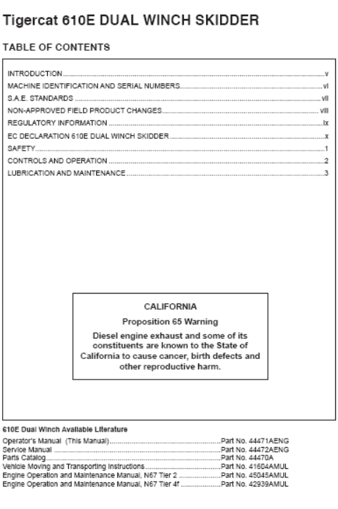 Introduction Machine Identification And Serial Numbers Sae Standards Non-approved Field Product Changes Regulatory Information Ec Declaration 610e Dual Winch Skidder Safety Controls And Operation. Lubrication And Maintenance